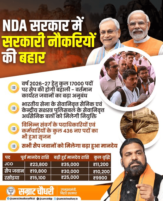 Bihar: एनडीए सरकार ने युवाओं और सुरक्षा बलों के जवानों के लिए बड़ी राहत दी है. 2026–27 में हजारों सरकारी नौकरियों की बहाली के साथ SEP जवानों के मानदेय में बढ़ोतरी की गई है.