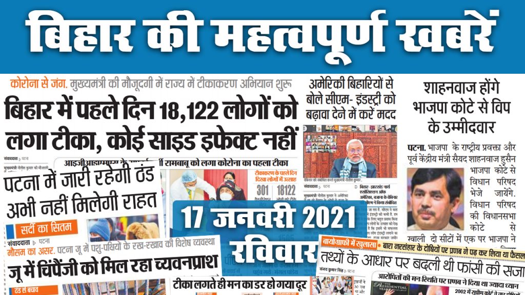 Bihar News, Patna, Bhagalpur, Gaya, Muzzaffarpur, Corona Vaccination Update, Weather Update, Crime News, Republic Day 2021: इंडिगो एयरलाइंस के स्टेशन मैनेजर रूपेश कुमार सिंह हत्याकांड मामले में नया खुलासा जल्द हो सकता है. डीजीपी ने बताया कि एयरपोर्ट पार्किंग को लेकर था विवाद. विधानमंडल का बजट सत्र 19 फरवरी से. अब छात्रों को रेडीमेड ड्रेस, जीविका से होगी खरीदारी. आज से चंडीगढ़ और सूरत के लिए सीधी विमान सेवा. राज्य में आज भी रहा कोहरा, ठंड में हल्की कमी होने की संभावना. जदयू में बेहतर प्रदर्शन करने वाले कैबिनेट में हो सकेंगे शामिल. अब तय सीमा से तेज गाड़ी चलाई तो लगेगा जुर्माना…