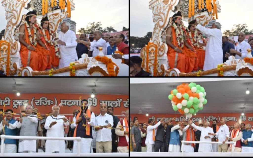 Bihar News: रावण दहन करने से पहले राम, सीता, लक्ष्मण की वेशभूषा में आये कलाकारों की आरती राज्यपाल राजेन्द्र विश्वनाथ आर्लेकर और मुख्यमंत्री नीतीश कुमार उतारी.