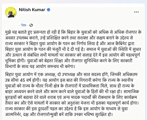 यह भी लिखा कि, ‘सामाजिक बुराइयों को बढ़ावा देने वाले शराब और अन्य मादक पदार्थों की रोकथाम के लिए कार्यक्रम तैयार कर और ऐसे मामलों में सरकार को अनुशंसा भेजना भी इसका महत्वपूर्ण कार्य होगा. राज्य सरकार की इस दूरदर्शी पहल का उद्देश्य है कि, इस आयोग के माध्यम से युवा आत्मनिर्भर, दक्ष और रोजगारोन्मुखी बनें ताकि उनका भविष्य सुरक्षित हो.’ इस तरह से देखा जा सकता है कि, मुख्यमंत्री नीतीश कुमार ने बड़ी सौगात दी. याद दिला दें कि, सीएम नीतीश कई बार बिहार में जल्द से जल्द बहाली और बड़े स्तर पर युवाओं को रोजगार देने की बात कही है. जिसके बाद आज बड़ा ऐलान भी कर दिया गया है.
