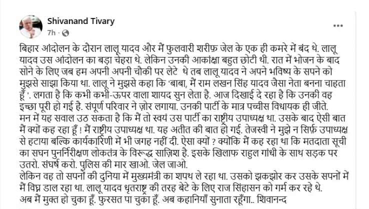 शिवानंद तिवारी ने अपने पोस्ट में लिखा, “बिहार आंदोलन के दौरान लालू यादव और मैं फुलवारी शरीफ़ जेल के एक ही कमरे में बंद थे. लालू यादव उस आंदोलन का बड़ा चेहरा थे. लेकिन उनकी आकांक्षा बहुत छोटी थी. रात में भोजन के बाद सोने के लिए जब हम अपनी अपनी चौकी पर लेटे थे, तब लालू यादव ने अपने भविष्य के सपने को मुझसे साझा किया था. लालू ने मुझसे कहा कि ‘बाबा, मैं राम लखन सिंह यादव जैसा नेता बनना चाहता हूं’. लगता है कि कभी कभी-ऊपर वाला शायद सुन लेता है. आज दिखाई दे रहा है कि उनकी वह इच्छा पूरी हो गई है.” आज लालू यादव धृतराष्ट्र की तरह बेटे के लिए राज सिंहासन को गर्म कर रहे थे. अब मैं मुक्त हो चुका हूं. फुरसत पा चुका हूं. अब कहानियां सुनाता रहूंगा.”