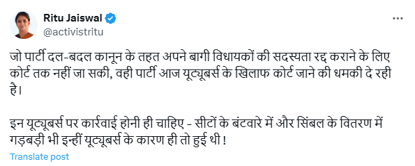 रितु जायसवाल ने अपने पोस्ट में लिखा, ‘जो पार्टी दल-बदल कानून के तहत अपने बागी विधायकों की सदस्यता रद्द कराने के लिए कोर्ट तक नहीं जा सकी, वही पार्टी आज यूट्यूबर्स के खिलाफ कोर्ट जाने की धमकी दे रही है. इन यूट्यूबर्स पर कार्रवाई होनी ही चाहिए. सीटों के बंटवारे में और सिंबल के वितरण में गड़बड़ी भी इन्हीं यूट्यूबर्स के कारण ही तो हुई थी.’ इस तरह से इस पोस्ट में रितु जायसवाल ने अपना भड़ास निकाला.