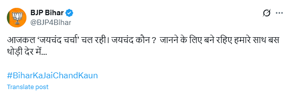 बता दें कि, तेजप्रताप यादव का पोस्ट सामने आने के बाद अब हर कोई यही सवाल कर रहा था कि, आखिर ‘जयचंद’ कौन है. तेजप्रताप यादव किसकी ओर इशारा कर रहे हैं. तमाम गतिविधियों के बीच कयासों का बाजार बेहद गर्म हो गया. इस बीच बीजेपी ने सोशल मीडिया अकाउंट एक्स के जरिये एक पोस्ट शेयर किया. जिसमें एक पोस्टर शेयर करते हुए उस पर लिखा गया कि, ‘हम बतायेंगे जयचंद कौन ? बने रहिए हमारे साथ.’ इसके साथ ही बीजेपी ने कैप्शन में यह भी लिखा कि, ‘आजकल ‘जयचंद चर्चा’ चल रही. जयचंद कौन ? जानने के लिए बने रहिए हमारे साथ बस थोड़ी देर में…’ इस तरह से बीजेपी के पोस्ट ने हलचल मचा दी और नजरें भाजपा पर टिक गई है.