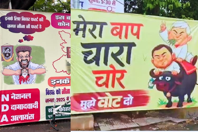 वहीं, एनडीए समर्थकों की ओर से भी पलटवार हुआ है. एक पोस्टर में राजद सुप्रीमो लालू यादव को भैंस पर बैठे और मुंह में चारा चबाते हुए दिखाया गया है. तेजस्वी यादव को उनके आगे बैठे दिखाया गया है. इस पर लिखा गया है- “मेरा बाप चारा चोर, मुझे वोट दो.” यह पोस्टर साफ तौर पर चारा घोटाले और वंशवाद के मुद्दे को निशाने पर लेता है.