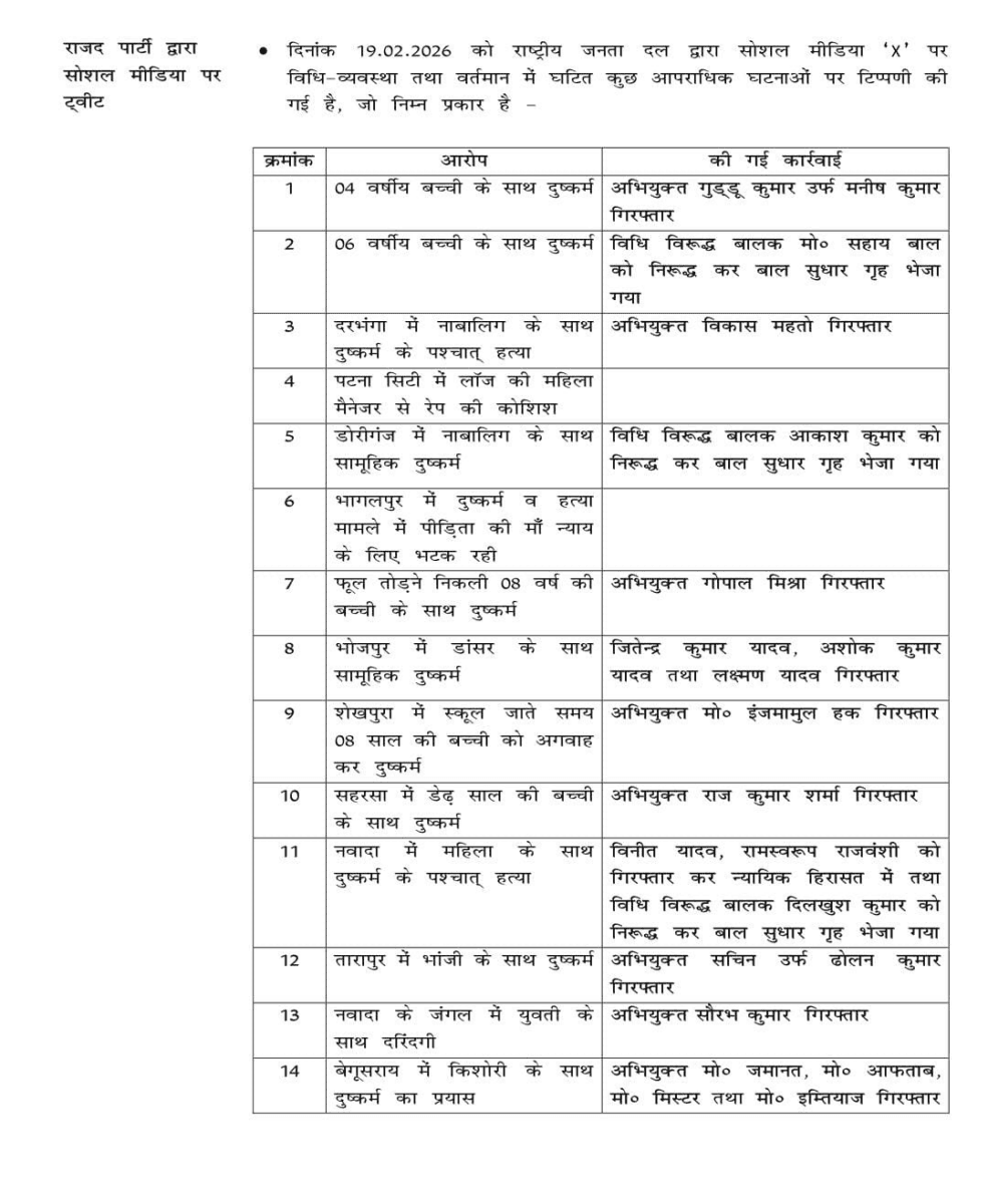 Bihar Politics: 19 फरवरी को आरजेडी के एक्स अकाउंट के जरिए एक पोस्ट शेयर किया गया था. इसमें लड़कियों के साथ राज्य के अलग-अलग जिलों में 14 आपराधिक घटनाओं का जिक्र किया गया. राजद की ओर से कानून-व्यवस्था पर सवाल उठाए गए थे. इस पोस्ट का जवाब आज बिहार सरकार की तरफ से दिया गया.