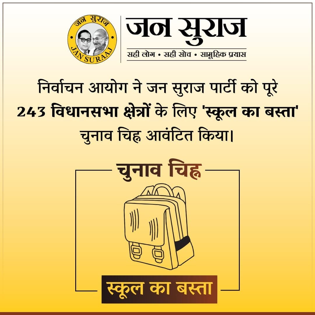 Bihar Politics: बिहार में परिवर्तन का शंखनाद कर चुके जन सुराज पार्टी के सूत्रधार प्रशांत किशोर का सर्वाधिक फोकस शिक्षा और रोजगार पर है. इसी को ध्यान में रखते हुए जन सुराज ने चुनाव आयोग से चुनाव चिन्ह “स्कूल बैग” की मांग की थी, जिसे आयोग ने स्वीकार कर लिया है. निर्वाचन आयोग ने जन सुराज पार्टी को चुनाव चिन्ह “स्कूल बैग” आवंटित कर दिया है. जन सुराज के सभी 243 प्रत्याशी “स्कूल बैग” के निशान पर चुनाव लड़ेंगे. बिहार में 243 प्रत्याशी अब इसी चुनाव-चिह्न पर वोट मांगेंगे.