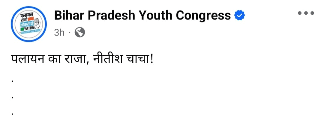 इसके अलावा फोटो के जरिये भी मुख्यमंत्री नीतीश कुमार पर बिहार में पलायन को लेकर तीखा तंज कसा गया. शेयर किए गए फोटो पर मुख्यमंत्री नीतीश कुमार की तस्वीर के साथ लिखा गया कि,’डबल इंजन सरकार प्रोडक्शन की प्रस्तुति ! पलायन का राजा. एक राजा… जो कुर्सी नहीं छोड़ता, लेकिन युवाओं को राज्य छोड़ने पर मजबूर करता है!’ इस तरह से बड़ी बात बिहार प्रदेश यूथ कांग्रेस की ओर से मुख्यमंत्री नीतीश कुमार को लेकर बड़ी बात लिखी गई. बता दें कि, चुनाव के मद्देनजर लगातार बयानबाजी का दौर देखा जा रहा है. पिछले दिनों जब राहुल गांधी बिहार आए थे, तब उन्होंने पलायन का जिक्र किया था.
