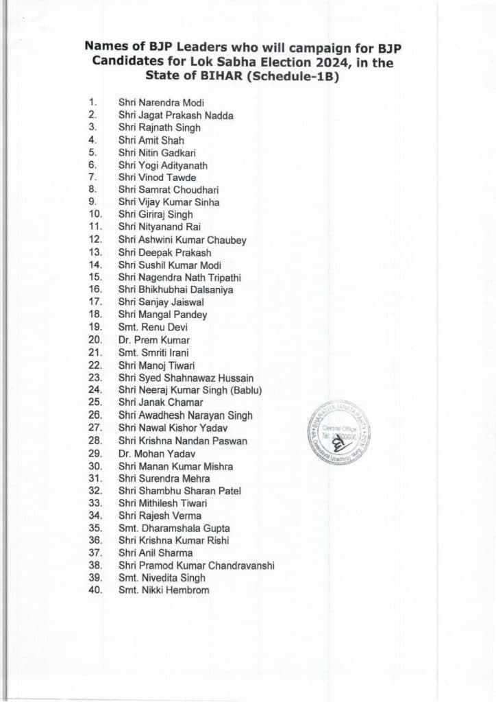 Bihar Politics: भाजपा ने लोकसभा चुनाव में अपने स्टार प्रचारकों की सूची जारी कर दी है. सूची में जहां बेटिकट हुए नेताओं के नाम हैं, वहीं कई विधायक और कई उम्मीदवारों के नाम भी सूची में शामिल किये गये हैं.