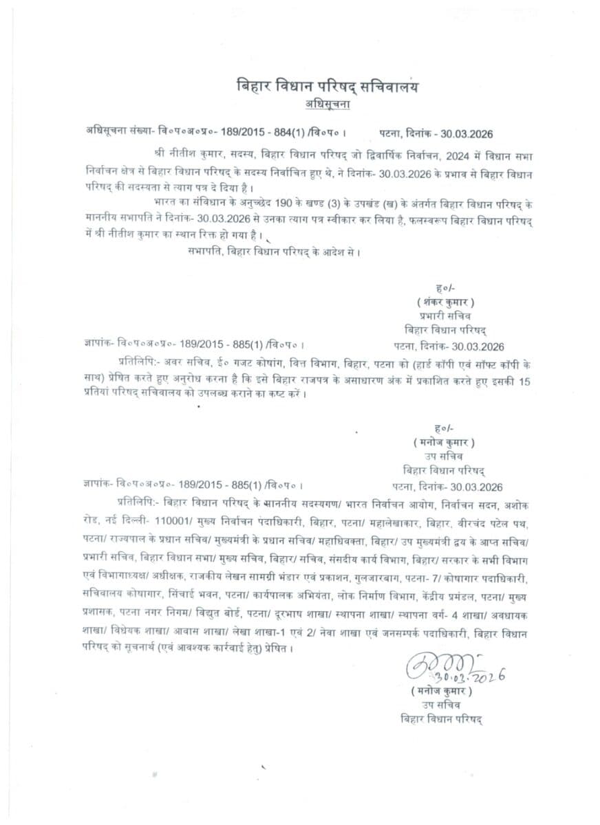 बिहार विधान परिषद सचिवालय ने तुरंत नोटिफिकेशन जारी कर दिया. इसमें कहा गया कि 30 मार्च 2026 से नीतीश कुमार की सदस्यता खत्म हो गई है. संविधान के अनुच्छेद 190(3)(ख) के तहत सभापति ने इस्तीफा स्वीकार कर लिया है, जिसके बाद उनकी सीट रिक्त हो गई.