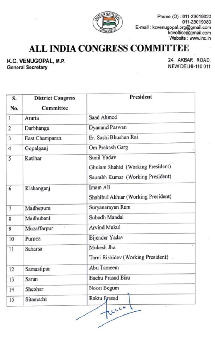 पार्टी ने पटना ग्रामीण एक के अध्यक्ष पद की जिम्मेदारी सुमित कुमार सन्नी को दी गई है, जबकि उदय कुमार चंद्रवंशी को कार्यकारी अध्यक्ष बनाया गया है. पटना ग्रामीण-दो के अध्यक्ष पद का जिम्मा गुरजीत सिंह को दिया गया है, जबकि नीतू निषाद को कार्यकारी अध्यक्ष बनाया गया है. पटना के अतिरिक्त मुजफ्फरपुर कांग्रेस अध्यक्ष पद की जिम्मेदारी अरविंद मुकुल को दी गई है. भागलपुर अध्यक्ष के पद पर परवेज जमाल को दिया गया है. गया में संतोष कुमार को अध्यक्ष बनाया गया है. साथ ही दो कार्यकारी अध्यक्ष बनाए गए हैं, शहाबुद्दीन रहमानी व उदय मांझी. नालंदा में नरेश अकेला, नवादा में सतीश कुमार को अध्यक्ष बनाया गया है.