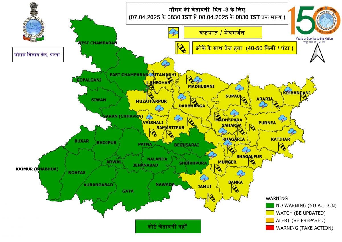 पटना मौसम विज्ञान केंद्र द्वारा जारी अपडेट में बताया गया कि सीतामढ़ी, शिवहर, मुजफ्फरपुर, दरभंगा, वैशाली, समस्तीपुर, मधेपुरा, सहरसा, सुपौल, अररिया, किशनगंज, पूर्णिया, कटिहार, भागलपुर, बांका, जमुई, मुंगेर और खगड़िया जिले में 7 और 8 अप्रैल को बारिश, मेघगर्जन और वज्रपात की प्रबल संभावना है. इस दौरान 40 से 50 किमी प्रतिघंटे की रफ्तार से हवा चल सकती है.