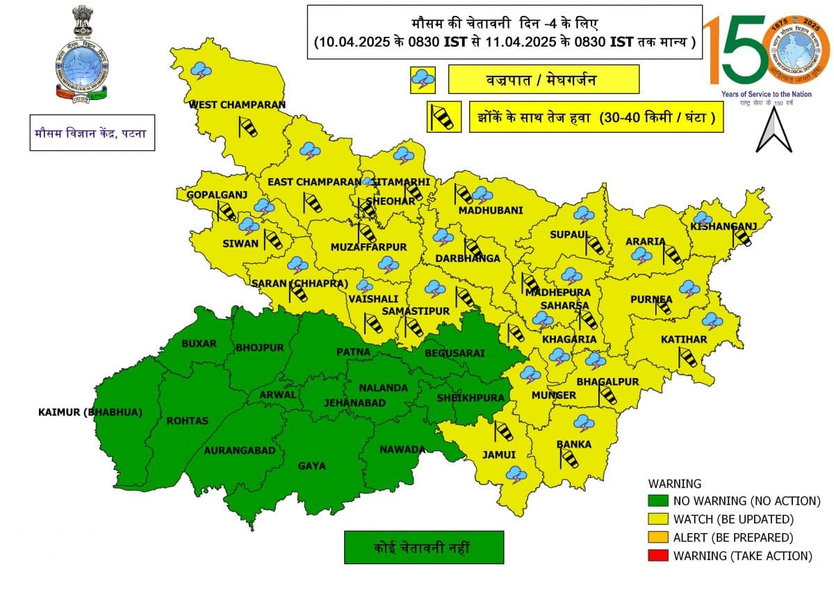 पटना मौसम विज्ञान केंद्र ने अपने लेटेस्ट अपडेट में बताया कि 10 और 11 अप्रैल को बिहार के पश्चिम चंपारण, पूर्वी चंपारण, गोपालगंज, सिवान, सारण, सीतामढ़ी, शिवहर, मधुबनी, दरभंगा, मधुबनी, सुपौल, अररिया, किशनगंज, पूर्णिया, कटिहार, भागलपुर, मुंगेर, बांका, जमुई, खगड़िया, वैशाली, समस्तीपुर, मधेपुरा और सहरसा जिला में बारिश हो सकती है. साथ ही, इन जिलों में 30 से 40 किमी प्रतिघंटे की रफ्तार से हवा चलने, मेघगर्जन और वज्रपात की भी उम्मीद है.