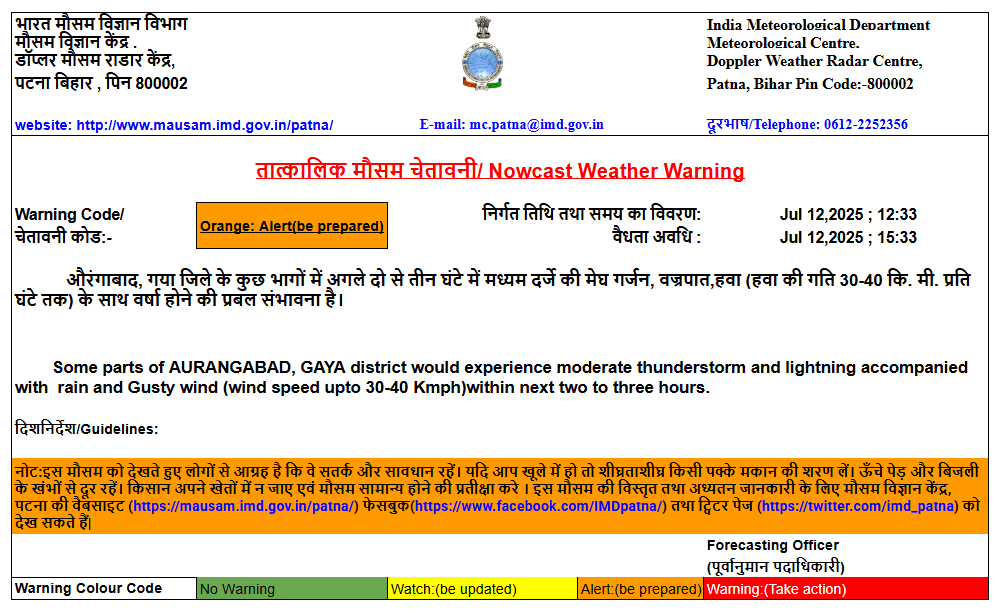 पटना मौसम विभाग की ओर से जिन जिलों में ऑरेंज अलर्ट जारी किया गया है, उसमें औरंगाबाद और गया शामिल है. तो वहीं जिन जिलों में येलो अलर्ट जारी किया गया है, इनमें पटना, अरवल, जहानाबाद, नालंदा, नवादा और जमुई जिला शामिल है. इस दौरान लोगों से सतर्क रहने की भी अपील की गई है. ऐसे में साफ देखा जा रहा है कि, मानसून बिहार के जिलों में फिर से एक्टिव हो रहा है.