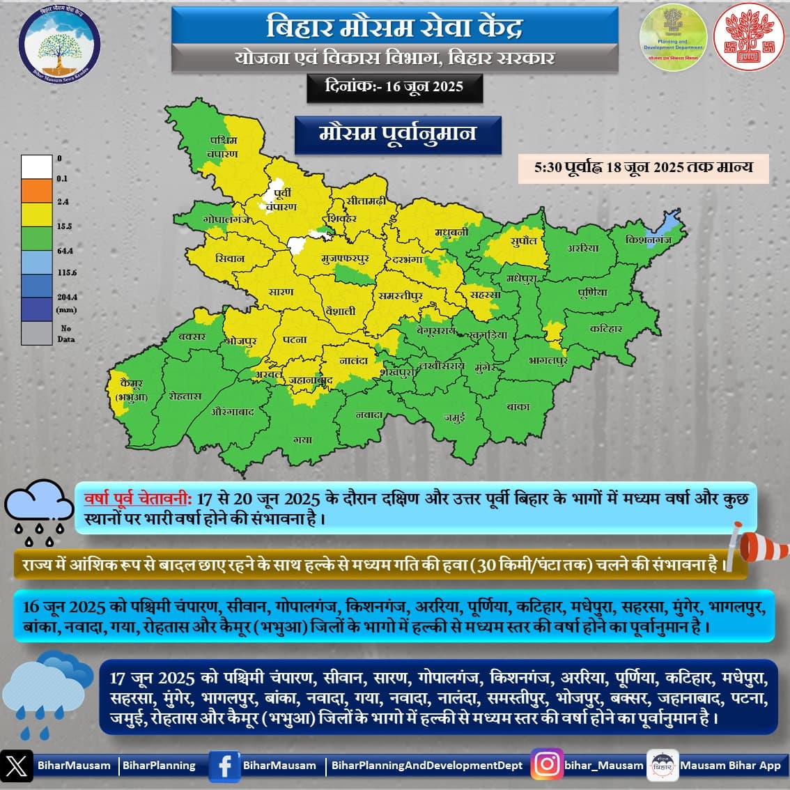 दक्षिण और उत्तर पूर्वी बिहार में 17 से 20 जून 2025 के दौरान भारी बारिश होने की संभावना है. इस वक्त राज्य में आंशिक रूप से बादल छाए रहने के साथ हल्के से मध्यम गति की हवा चलेगी. 16 जून 2025 को पश्चिमी चंपारण, सीवान, गोपालगंज, किशनगंज, अररिया, पूर्णिया, कटिहार, मधेपुरा, सहरसा, मुंगेर, भागलपुर, बांका, नवादा, गया, रोहतास और कैमूर जिलों के भागों में हल्की से मध्यम स्तर की वर्षा होने का पूर्वानुमान है. वहीं 17 जून 2025 को पश्चिमी चंपारण, सीवान, सारण, गोपालगंज, किशनगंज, अररिया, पूर्णिया, कटिहार, मधेपुरा, सहरसा, मुंगेर, भागलपुर, बांका, नवादा, गया, नवादा, नालंदा, समस्तीपुर, भोजपुर, बक्सर, जहानाबाद, पटना, जमुई, रोहतास और कैमूर (भभुआ) जिलों के भागो में हल्की से मध्यम स्तर की वर्षा होगी.