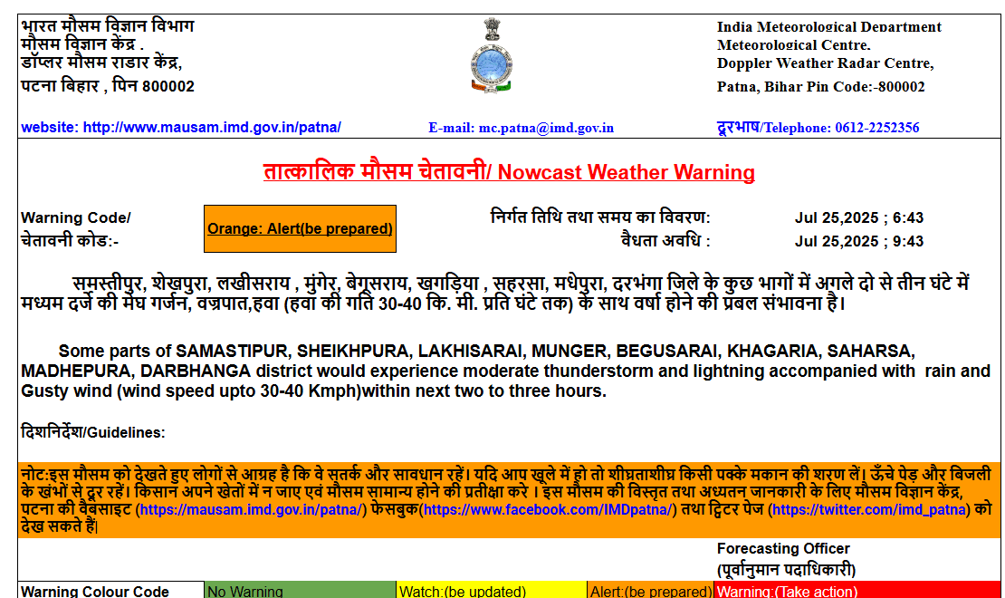 मौसम विभाग की माने तो, मानसून की ट्रफ लाइन पटना से गुजर रही है. ऐसे में शुक्रवार से अगले 48 घंटे तक बिहार के विभिन्न इलाकों में झमाझम बारिश होने के आसार हैं. दक्षिण बिहार में बारिश, मेघ गर्जन और वज्रपात की आशंका के लिहाज से ऑरेंज और उत्तर बिहार के कई इलाके के लिए येलो अलर्ट जारी किया गया है. आइएमडी पटना के आधिकारिक पूर्वानुमान के अनुसार 25 जुलाई को राज्य के उत्तर-पूर्व, दक्षिण-पश्चिम दक्षिण-मध्य और दक्षिण-पूर्व इलाके में अधिकतर जगहों पर झमाझम बारिश के आसार हैं.