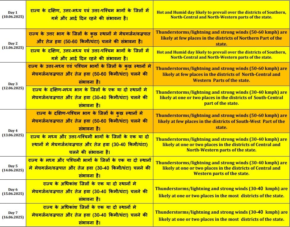 अगले कुछ दिनों में उत्तर बिहार के कुछ हिस्सों में हल्की बारिश और गरज के साथ बौछारें पड़ने की संभावना जताई गई है, विशेषकर 11 से 16 जून के बीच. वहीं, दक्षिण बिहार में ज्यादातर इलाकों में मौसम शुष्क बना रहेगा, हालांकि 12 जून के बाद कुछ स्थानों पर बारिश हो सकती है. साथ ही, कई जिलों में 50-60 किमी/घंटा की रफ्तार से तेज़ हवाएं और वज्रपात की चेतावनी भी दी गई है.