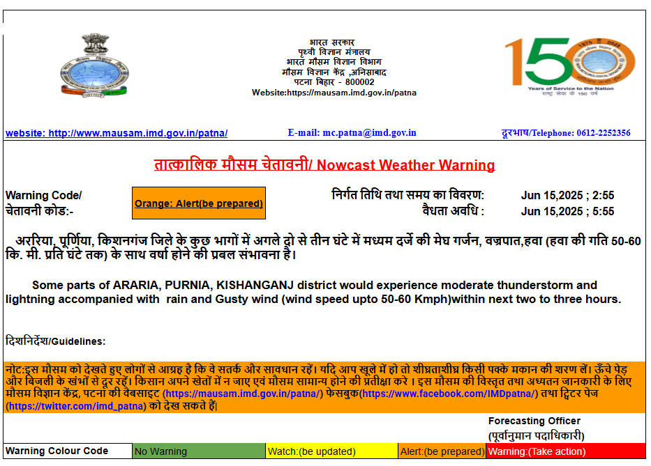 बिहार में मानसून के आगमन के दौरान वातावरण में बढ़ी हुई नमी, निम्र स्तर पर पूर्वी पश्चिम हवाओं का मिलन और तापमान के उच्च स्तर के कारण तीव्र मेघगर्जन, वज्रपात, तेज आंधी-तूफान की संभावना प्रबल होगी. ऐसे में राज्य के अधिकांश जिलों में कुछ स्थानों पर तेज आंधी और वज्रपात की संभावना है. रविवार को मौसम विभाग ने सीमांचल इलाके के जिलों अररिया,किशनगंज और पूर्णिया में भी बारिश व वज्रपात की संभावना देखकर अलर्ट जारी किया है.