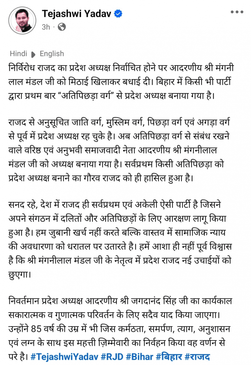 इसके साथ ही तेजस्वी यादव ने लिखा कि, “निर्विरोध राजद का प्रदेश अध्यक्ष निर्वाचित होने पर आदरणीय मंगनी लाल मंडल जी को मिठाई खिलाकर बधाई दी. बिहार में किसी भी पार्टी द्वारा प्रथम बार “अतिपिछड़ा वर्ग” से प्रदेश अध्यक्ष बनाया गया है. राजद से अनुसूचित जाति वर्ग, मुस्लिम वर्ग, पिछड़ा वर्ग एवं अगड़ा वर्ग से पूर्व में प्रदेश अध्यक्ष रह चुके हैं. अब अतिपिछड़ा वर्ग से संबंध रखने वाले वरिष्ठ एवं अनुभवी समाजवादी नेता आदरणीय मंगनीलाल मंडल जी को अध्यक्ष बनाया गया है. सर्वप्रथम किसी अतिपिछड़ा को प्रदेश अध्यक्ष बनाने का गौरव राजद को ही हासिल हुआ है.”