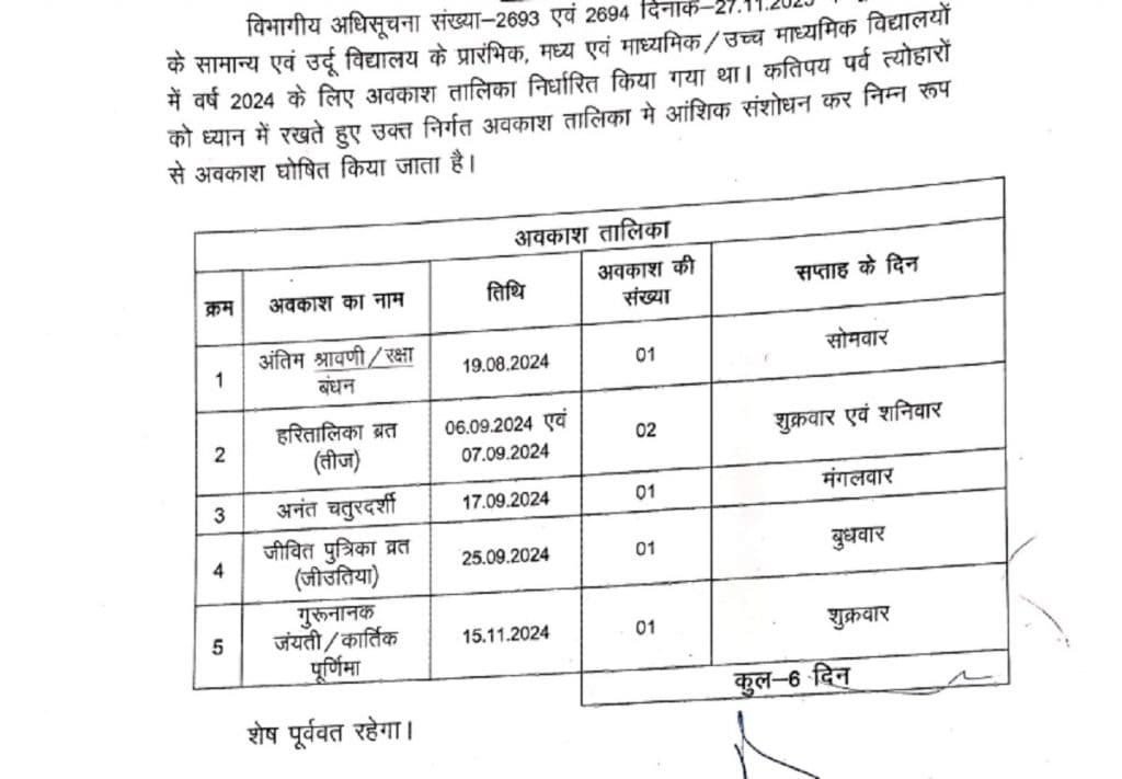 नयी सूची में तीज के मौके पर दो दिन अवकाश का प्रवधान किया गया है. वहीं गुरुनानक जयंती समेत पांच नये दिवसों पर छुट्टी की घोषणा की गयी है. इनमें रक्षाबंधन के दिन एक दिन की छुट्टी रहेगी. अनंत चतुरदर्शी को भी अब स्कूल में अवकाश रहेगा. इसी तरह जीतिया के दिन में स्कूल में एक दिन का अवकाश रहेगा. इसके अलावा गुरुनानक जयंती के दिन भी बिहार में अब स्कूल बंद रहेंगे.