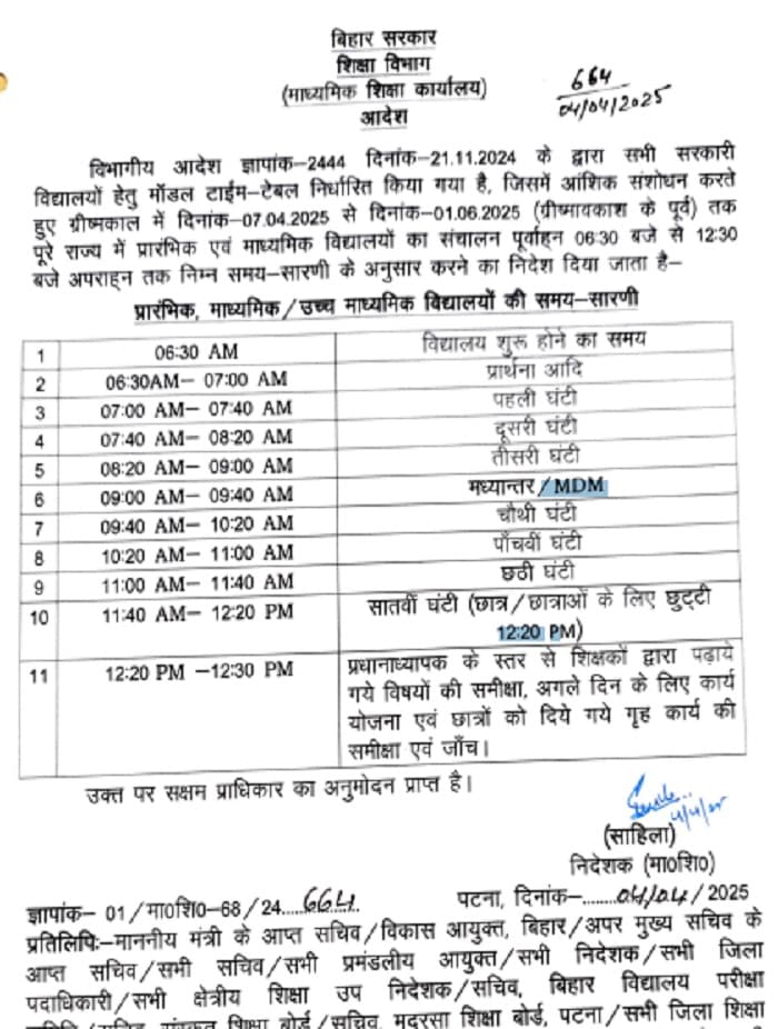 Bihar School : पटना. बिहार के शिक्षा विभाग ने राज्य के सभी सरकारी स्कूलों के लिए मॉडल टाइम टेबल निर्धारित किया है. इस नए आदेश के मुताबिक, 7 अप्रैल 2025 से 1 जून 2025 तक पूरे राज्य के प्रारंभिक और माध्यमिक स्कूलों का संचालन सुबह साढ़े छः बजे से दोपहर साढ़े 12 बजे तक संचालित किए जाएंगे. माध्यमिक शिक्षा विभाग ने इसको लेकर आदेश जारी किया है.