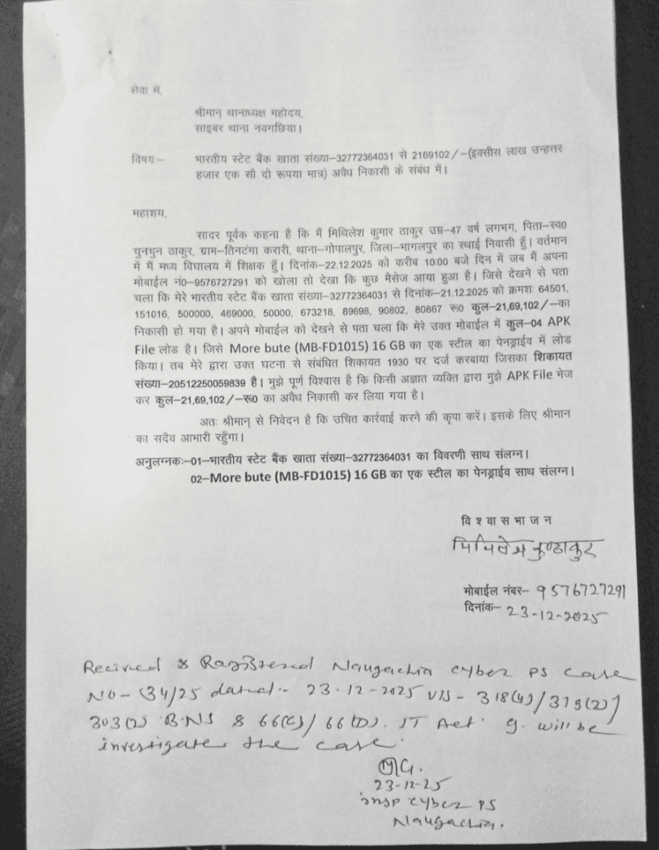 मोबाइल की जांच के दौरान उसमें चार संदिग्ध APK फाइल पाई गई, जिन्हें ठगों की तरफ से भेजे जाने की आशंका जताई जा रही है. पीड़ित ने साक्ष्य के तौर पर इन फाइलों को एक पेन ड्राइव में सुरक्षित रख लिया है. घटना के तुरंत बाद उन्होंने राष्ट्रीय साइबर हेल्प लाइन 1930 पर शिकायत दर्ज कराई, जिसकी शिकायत संख्या 20512250059839 है. इसके बाद शिक्षक मिथिलेश कुमार ठाकुर ने नवगछिया साइबर थाना में लिखित आवेदन देकर प्राथमिकी दर्ज करवाई.