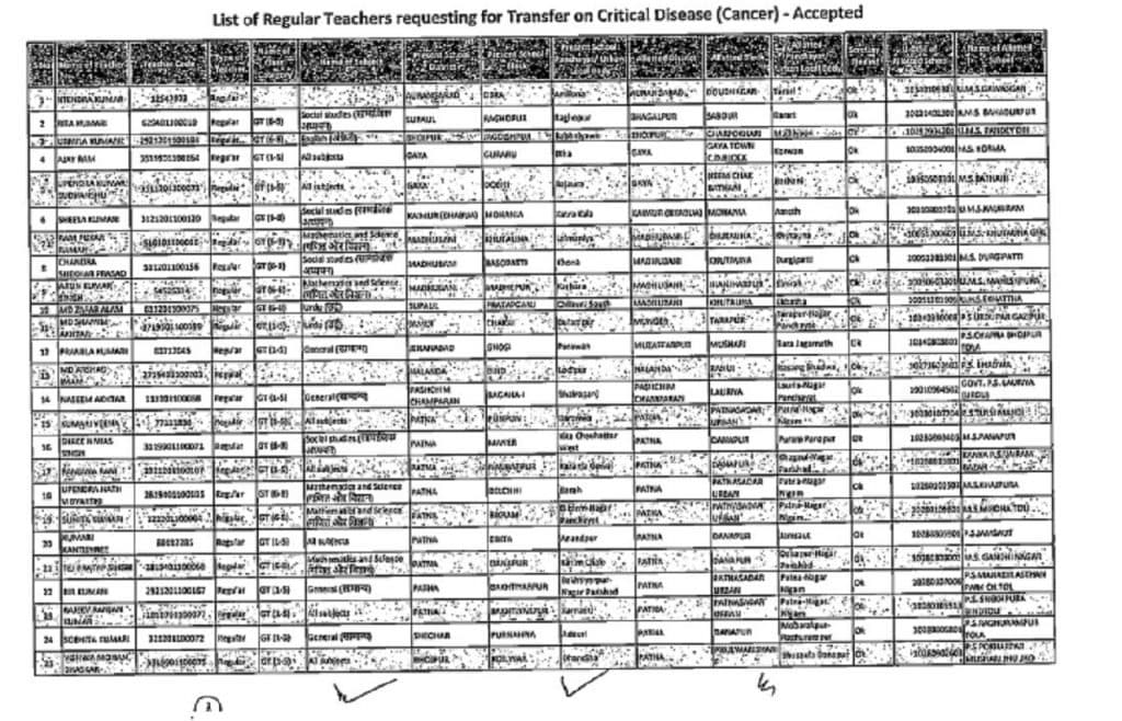 Bihar Teacher Transfer : पटना. बिहार के ट्रांसफर का इंतजार कर रहे शिक्षकों के लिए बड़ी खबर है. शिक्षक की ट्रांसफर प्रक्रिया शुरू हो गई है. पहले फेज में 35 विशिष्ट शिक्षकों का तबादला हुआ है. ये सभी शिक्षक कैंसर जैसी गंभीर बीमारी से ग्रस्त हैं. पहले चारण में तीन शिक्षकों का आवेदन दस्तावेज संलग्न नहीं रहने के कारण अस्वीकृत कर दिया गया है. वहीं 9 शिक्षकों के आवेदन को इस श्रेणी का नहीं माना गया है. उसे संबंधित श्रेणी में पुनर्विचार हेतु रखा गया.