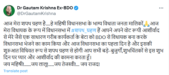 सदन में आज शपथ लेने से पहले विधायक डॉ. गौतम कृष्ण ने एक्स के जरिये पोस्ट शेयर कर लिखा था, ‘आज मेरा शपथ ग्रहण है. हे महिषी विधानसभा के भाग्य विधाता जनता मालिकों आज मेरा विधायक के रूप में विधानसभा में शपथ ग्रहण है. आपने अपने वोट रूपी आशीर्वाद से मेरे जैसे एक साधारण गरीब कार्यकर्ता के बेटा को BDO से विधायक बना करके विधानसभा भेजने का काम किया.’
