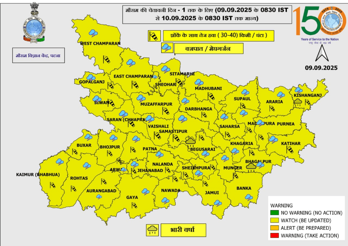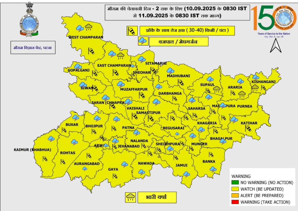 मौसम विभाग की माने तो, 10 सितंबर को किशनगंज, बेगूसराय और भागलपुर में भारी बारिश होगी. जबकि 11 सितंबर को पश्चिमी चंपारण, पूर्वी चंपारण, सुपौल, अररिया और किशनगंज में भारी बारिश की चेतावनी जारी की गई है. इसके अलावा बाकी के जिलों में 30 से 40 किलोमीटर प्रति घंटे की रफ्तार से हवा और ठनका गिरने की भी संभावना जताई गई है.