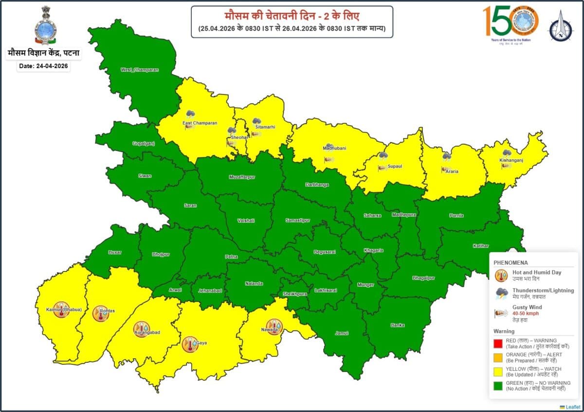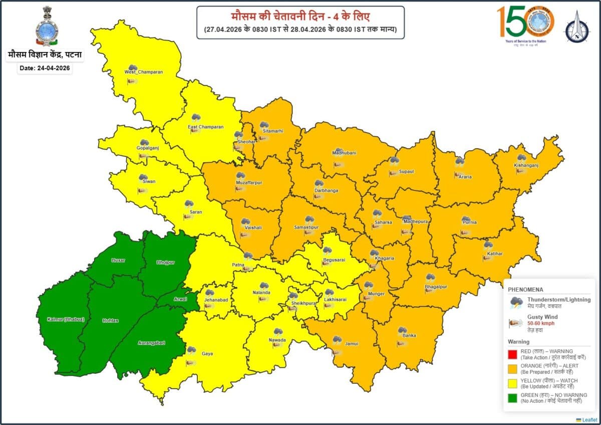 27 और 28 अप्रैल को पूरे राज्य में मौसम खराब रहने की संभावना है. इस दौरान पटना, भागलपुर और गया समेत कई जिलों में तेज हवा, बारिश और बिजली गिरने की आशंका है. इस बदलाव से तापमान में गिरावट आएगी और लोगों को गर्मी से राहत मिलेगी.