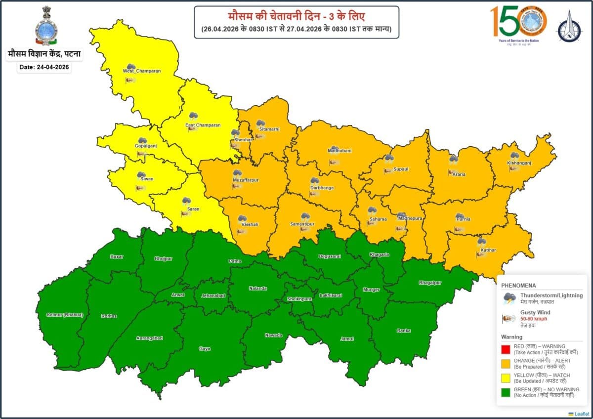 रविवार को मौसम और ज्यादा एक्टिव होगा. उत्तर बिहार के कई जिलों में तेज आंधी और बारिश का ऑरेंज अलर्ट जारी किया गया है. सीतामढ़ी, मुजफ्फरपुर, दरभंगा, समस्तीपुर, पूर्णिया, किशनगंज समेत कई जिलों में भारी बारिश और वज्रपात की चेतावनी है. इसके अलावा सारण, सीवान, गोपालगंज और चंपारण के इलाकों में भी येलो अलर्ट लागू रहेगा.
