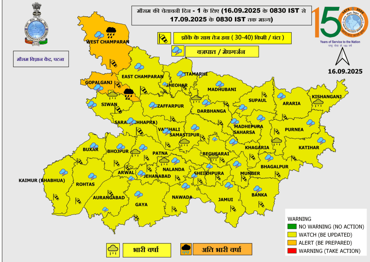पटना मौसम विज्ञान केंद्र ने अलर्ट में बताया कि दो जिलों में भारी बारिश को लेकर ऑरेंज अलर्ट जारी किया है. इन जिलों में पश्चिम चंपारण और गोपालगंज शामिल है. यहां भारी बारिश के अलावा 30 से 40 किमी प्रति घंटा की गति से हवा चलने और ठनका गिरने को लेकर भी अलर्ट जारी हुआ है.