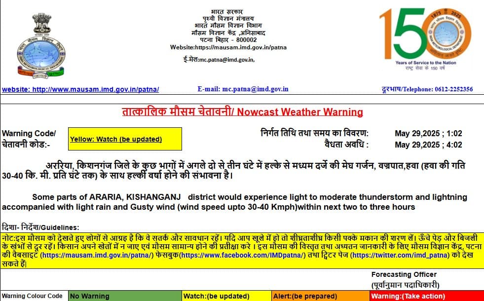 IMD पटना का पूर्वानुमान है कि अररिया, किशनगंज, मधुबनी और सुपौल समेत कुछ जिलों में अगले दो से तीन घंटे के अंदर हल्की बारिश और वज्रपात के साथ ही 30 से 40 किलोमीटर प्रति घंटे की रफ्तार से हवा चल सकती है. इसे लेकर इन जिलों में येलो अलर्ट सुबह-सुबह जारी किया गया.