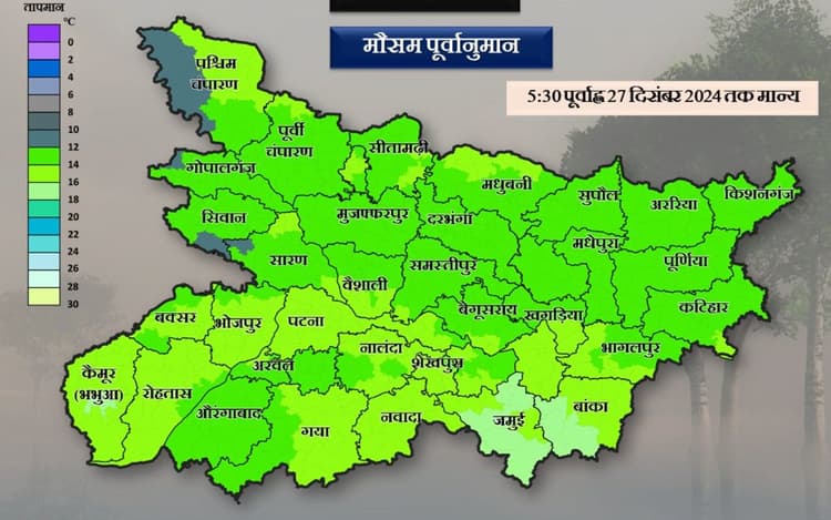 मौसम विभाग के अनुसार 27 दिसंबर से बिहार के कई जगहों पर बारिश होने की संभावना है. राज्य में अगले 40 से 72 घंटों के दौरान पश्चिमी विक्षोभ के सक्रिय होने का पूर्वानुमान है. 27 से 29 दिसंबर के बीच बक्सर, भोजपुर, रोहतास, भभुआ, औरंगाबाद, अरवल, पटना, गया, नालंदा, शेखपुरा, नवादा, बेगूसराय, लखीसराय और जहानाबाद के आसपास बारिश हो सकती है. वहीं गुरुवार सुबह के समय हल्के कोहरे का प्रभाव बना रहेगा. राज्य में पिछले 24 घंटों में दर्ज अधिकतम तापमान 30.1 डिग्री सेल्सियस बांका जिला के अमरपुर प्रखंड में दर्ज किया गया है. वहीं पिछले 24 घंटों में दर्ज न्यूनतम तापमान 10.1 डिग्री सेल्सियस बेगूसराय जिला के नावकोठी प्रखंड में दर्ज किया गया है.