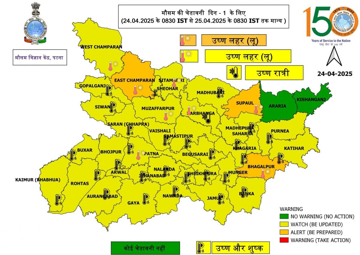 Bihar Weather: पटना मौसम विज्ञान केंद्र ने अपने पूर्वानुमान में बताया कि अगले 24 घंटे के दौरान बिहार के सभी जिलों में भयंकर गर्मी पड़ेगी. मौसम विभाग ने 3 जिलों में ऑरेंज और 35 जिलों में येलो अलर्ट जारी किया है.