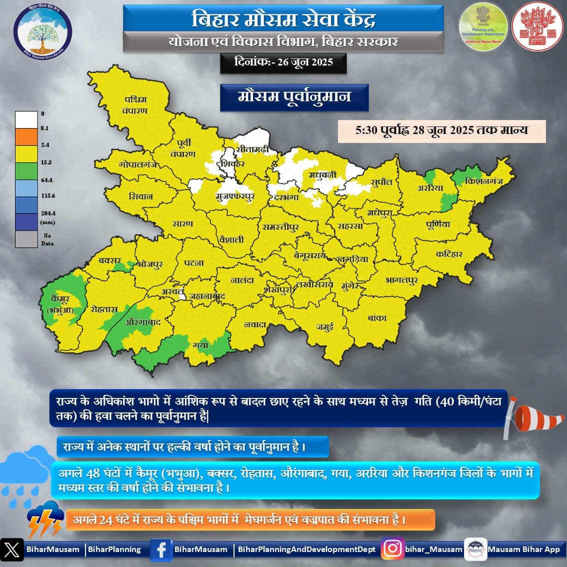 मौसम विभाग के अनुसार, कैमूर, बक्सर, रोहतास, औरंगाबाद, गया, अररिया और किशनगंज जिले के कई भागों में मध्यम स्तर की बारिश होने की संभावना है.औरंगाबाद, बक्सर, कैमूर, नालंदा, पश्चिम चंपारण, रोहतास, सारण और सीवान जिले के कई भागों में मेघगर्जन और वज्रपात होने की भी संभावना है. इन जिलों के लोगों को अलर्ट किया गया है. पटना में भी बारिश के आसार बन रहे हैं.