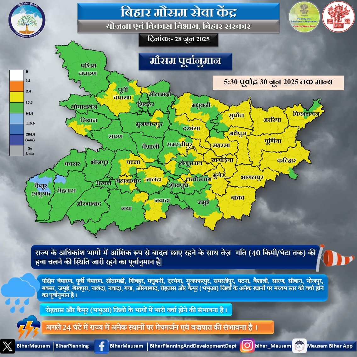 बिहार के अधिकतर हिस्सों में आसमान में बादल छाए रहेंगे. रविवार को 40 किलोमीटर प्रति घंटे की रफ्तार से हवा चलेगी. रोहतास, पटना, गया,नालंदा, शेखपुरा,नवादा, बेगूसराय, लखीसराय, जहानाबाद, अरवल और कैमूर के कई हिस्सों में भारी बारिश की संभावना है. जबकि पश्चिम चंपारण, पूर्वी चंपारण, नवादा, गया, मधुबनी, पटना, वैशाली समेत 22 जिलों में मध्यम स्तर की बारिश होने की संभावना बनी हुई है. लोगों को अलर्ट किया गया है.