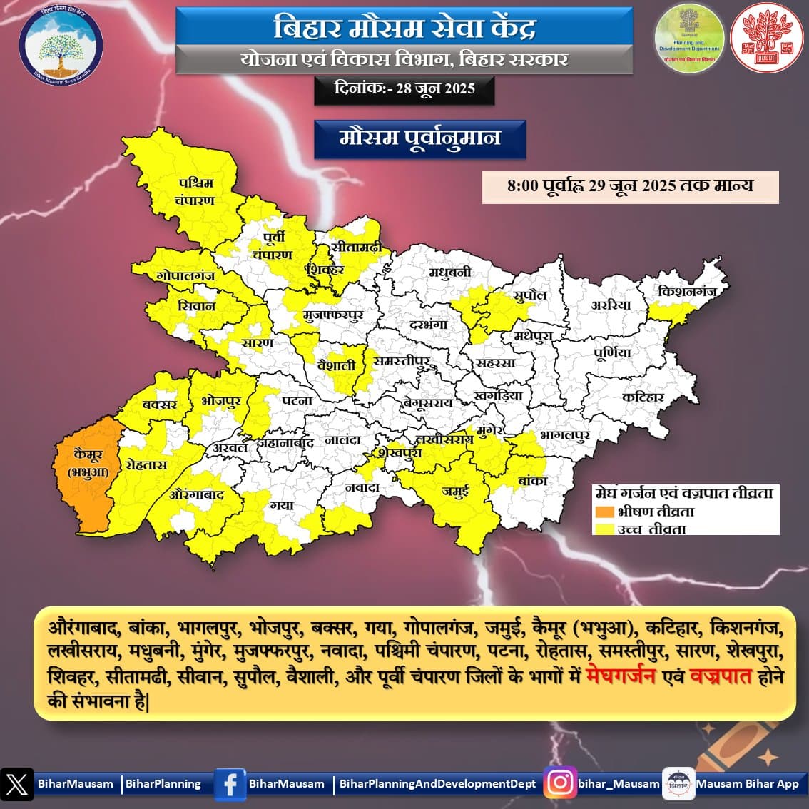 बिहार मौसम सेवा केंद्र के अनुसार, प्रदेश के अधिकतर जिलों में रविवार को मेघगर्जन और वज्रपात की संभावना है. इसे लेकर औरंगाबाद, बांका, भागलपुर, बक्सर, भोजपुर, जमुई, कैमूर, कटिहार, पटना समेत प्रदेश के 28 जिलों में अलर्ट जारी किया गया है. कैमूर में ऑरेंज अलर्ट है जबकि अन्य जिलों में येलो अलर्ट जारी किया गया है.