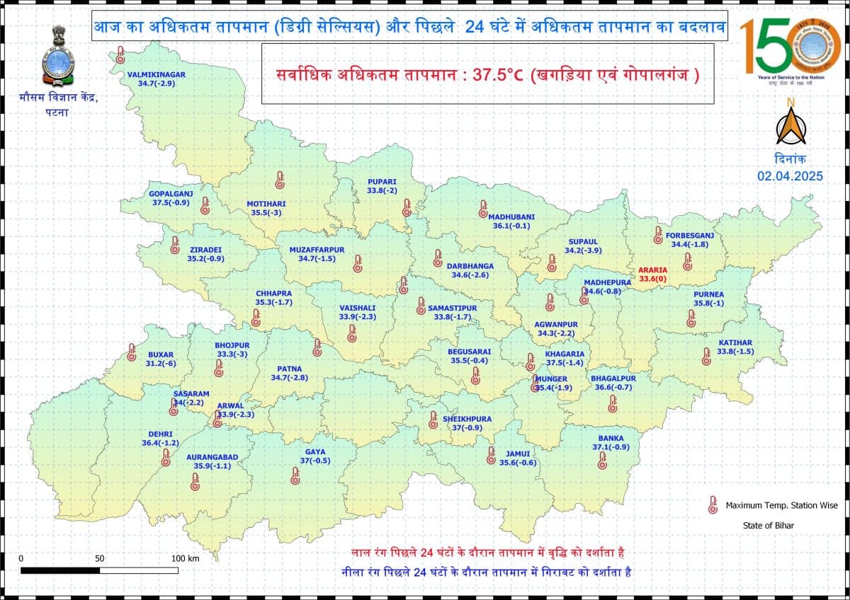 बिहार में तापमान लगातार चढ़ रहा है. बुधवार को सबसे अधिक तापमान खगड़िया और गोपालगंज में दर्ज हुआ. यहां 37.5 डिग्री पारा रहा. पिछले 24 घंटे में केवल एक जिले का तापमान नहीं बढ़ा. अररिया में पिछले दो दिनों से अधिकतम तापमान 33.6 डिग्री दर्ज हुआ है. बांकि तमाम जिलों का तापमान बढ़ा है. मुंगेर में 35.4 डिग्री, भागलपुर में 36.6 डिग्री, बांका में 37.1 डिग्री, गड़िया में 37.5 डिग्री, पटना में 34.7 डिग्री, डेहरी में 36.4 डिग्री, मुजफ्फरपुर 34.7 डिग्री और सुपौल में 34.2 डिग्री तापमान दर्ज किया गया. अन्य जिलों का पारा भी आसपास ही रहा.