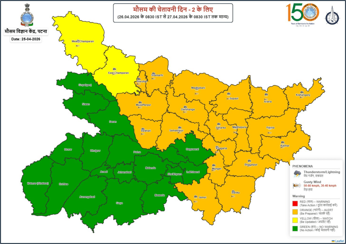 मौसम विभाग ने शाम होते-होते कई जिलों के मौसम में बदलाव की संभावना जताते हुए ऑरेंज अलर्ट जारी किया है. विभाग के मुताबिक, शिवहर, सीतामढ़ी, मधुबनी, सुपौल, अररिया, किशनगंज, मुजफ्फरपुर, दरभंगा, सहरसा, मधेपुरा, पूर्णिया, कटिहार, वैशाली, समस्तीपुर, खगड़िया, भागलपुर, मुंगेर, बांका और जमुई जिले में बादल गरजने और बिजली चमकने की संभावना जताई है.