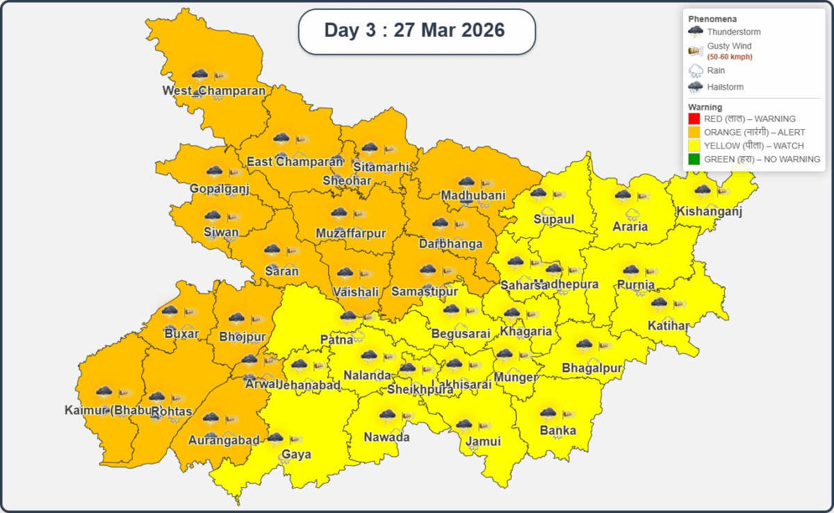मौसम विभाग के मुताबिक, 27 मार्च को बिहार के 18 जिलों में ऑरेंज अलर्ट और 20 जिलों में येलो अलर्ट जारी किया गया है. जिन जिलों में ऑरेंज अलर्ट जारी किया गया उनमें पूर्वी चंपारण, पश्चिमी चंपारण, सीतामढ़ी, शिवहर, मधुबनी, गोपालगंज, मुजफ्फरपुर, दरभंगा, सिवान, सारण, वैशाली, समस्तीपुर, बक्सर, भोजपुर, कैमूर, रोहतास, अरवल और औरंगाबाद शामिल है.