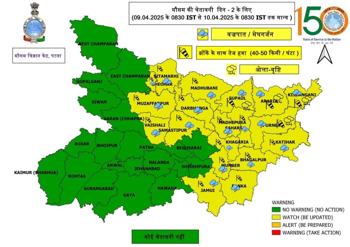 Bihar Weather: बिहार में एक बार फिर मौसम ने करवट ली है. अप्रैल के दूसरे सप्ताह में राज्यभर में तेज बारिश, वज्रपात और ओलावृष्टि का खतरा मंडरा रहा है. मंगलवार, 9 अप्रैल को बिहार के 27 जिलों में हल्की से मध्यम बारिश की संभावना है, वहीं 19 जिलों के लिए भारतीय मौसम विभाग (IMD) ने येलो अलर्ट जारी कर दिया है. किशनगंज, अररिया, पूर्णिया और सुपौल में ओले गिरने और आंधी के साथ बिजली गिरने की चेतावनी दी गई है.
