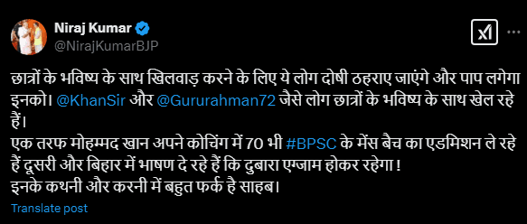नीरज कुमार ने आगे लिखा, ‘फैजल खान जी को चुनाव लड़ना है तो अपने राजनैतिक महत्वाकांक्षा को सिद्ध करने के लिए छात्रों के भविष्य के साथ खिलवाड़ क्यों कर रहे हैं?’ उन्होंने यह भी दावा किया कि खान सर और गुरु रहमान ने यूट्यूब पर BPSC को लेकर बेबुनियाद आरोप लगाए हैं. नीरज कुमार ने आगे लिखा, ‘खान और रहमान जी यूट्यूब पर बीएससी पर निराधार मनगढ़ंत और काल्पनिक आरोप लगा रहे हैं. सरकार छात्रों के साथ कोई अन्याय नहीं होने देगी यह लोग अपनी दुकान चमकाने के लिए राजनीति कर रहे हैं.’