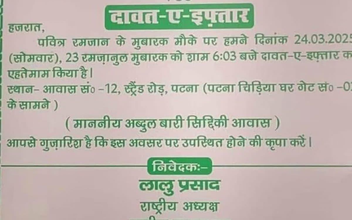 BJP- RJD: बिहार में इन दिनों इफ्तार पर खूब सियासत हो रही है. रविवार को बिहार सीएम नीतीश कुमार ने इफ्तार पार्टी का आयोजन किया था. सोमवार को लालू यादव की पार्टी और चिराग पासवान की पार्टी ने पटना में इफ्तार पार्टी का आयोजन करवाया. राजद पार्टी ने इफ्तार पार्टी को लेकर को निमंत्रण कार्ड छपवाया उसमें पार्टी के राष्ट्रीय अध्यक्ष का नाम ही गलत छपा हुआ है. इसके अलावा पार्टी के वरिष्ठ नेता अब्दुल बारी सिद्दीकी का नाम भी गलत लिखा हुआ है. बीजेपी ने जैसे ही इस कार्ड को देखा उसे बदला लेने का मौका मिल गया.
