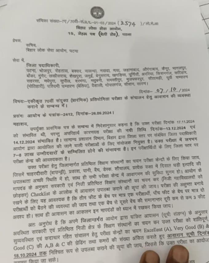 BPSC Exam: 70वीं BPSC परीक्षा की तारीख़ बदली, अब इस दिन होगा एग्जाम, चिट्ठी जारी