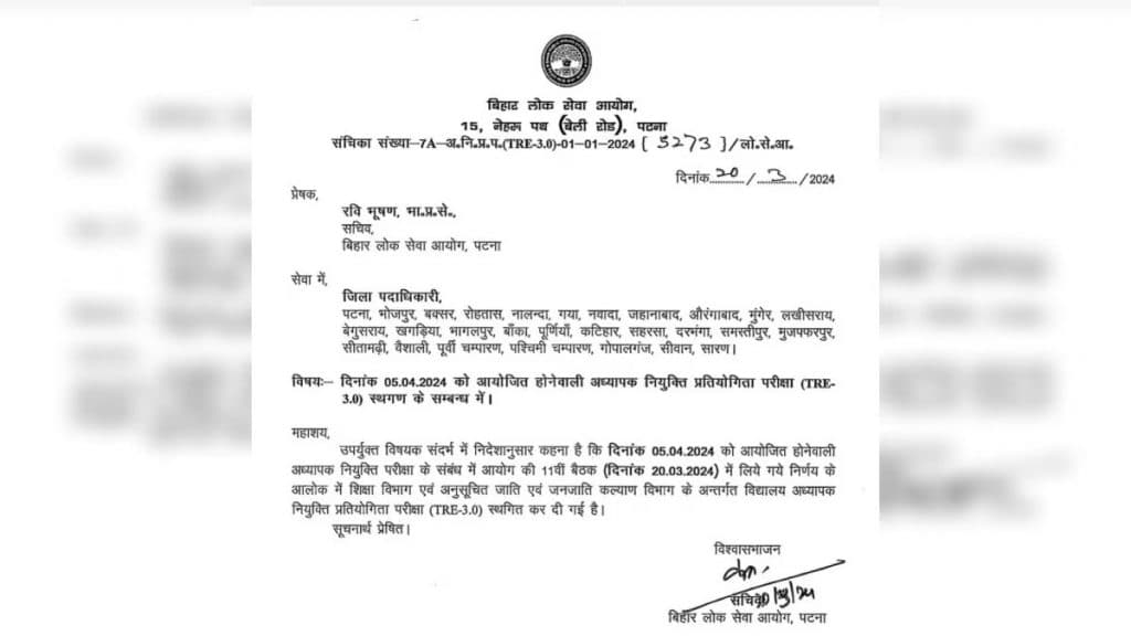 आयोग के सचिव रवि भूषण ने अपने पत्र में लिखा है कि ‘दिनांक 05.04.2024 को आयोजित होनेवाली अध्यापक नियुक्ति परीक्षा के संबंध में आयोग की 11वीं बैठक (दिनांक 20.03.2024) में यह फैसला लिया गया है. शिक्षा विभाग एवं अनुसूचित जाति एवं जनजाति कल्याण विभाग के अन्तर्गत विद्यालय अध्यापक नियुक्ति प्रतियोगिता परीक्षा (TRE-3.0) स्थगित कर दी गई है.