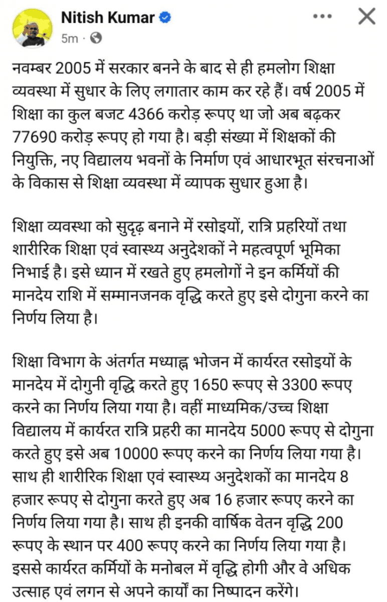 सीएम नीतीश ने अपने पोस्ट में लिखा कि, “नवम्बर 2005 में सरकार बनने के बाद से ही हमलोग शिक्षा व्यवस्था में सुधार के लिए लगातार काम कर रहे हैं. वर्ष 2005 में शिक्षा का कुल बजट 4366 करोड़ रुपए था जो अब बढ़कर 77690 करोड़ रुपए हो गया है. बड़ी संख्या में शिक्षकों की नियुक्ति, नए विद्यालय भवनों के निर्माण एवं आधारभूत संरचनाओं के विकास से शिक्षा व्यवस्था में व्यापक सुधार हुआ है.”