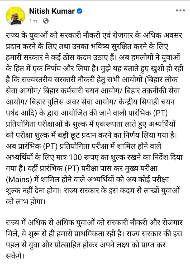 मुख्यमंत्री नीतीश कुमार ने आगे लिखा कि अब प्रारंभिक (PT) प्रतियोगिता परीक्षा में शामिल होने वाले अभ्यर्थियों के लिए मात्र 100 रूपए का शुल्क रखने का निर्देश दिया गया है. वहीं प्रारंभिक (PT) परीक्षा पास कर मुख्य परीक्षा (Mains) में शामिल होने वाले अभ्यर्थियों को अब कोई परीक्षा शुल्क नहीं देना होगा. राज्य सरकार के इस कदम से लाखों युवाओं को लाभ होगा. राज्य में अधिक से अधिक युवाओं को सरकारी नौकरी और रोजगार मिले, ये शुरू से ही हमारी प्राथमिकता रही है. राज्य सरकार की इस पहल से युवा और प्रोत्साहित होकर अपने लक्ष्य को प्राप्त कर सकेंगे.