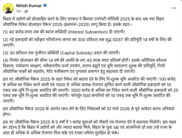 सीएम नीतीश ने लिखा कि बिहार में उद्योगों को प्रोत्साहित करने के लिए सरकार ने बियाडा एमनेस्टी पॉलिसी 2025 के बाद अब नया बिहार औद्योगिक निवेश प्रोत्साहन पैकेज 2025 (BIPPP-2025) लागू किया है. इसके तहत-