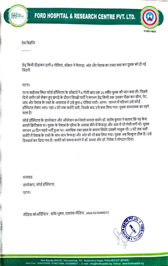 फोर्ड हॉस्पिटल के डायरेक्टर और ऑपरेशन करनेवाले जनरल सर्जन डॉ. संतोष कुमार ने बताया कि यह केस काफी क्रिटिकल था. युवक के पेशाब के एरिया के अलावा सीने में फेंफड़ा और आंत में भी गोली लगी थी. युवक लगभग 10 दिन पहले भर्ती हुआ था. अत्यधिक रक्त स्त्राव के कारण स्थिति उसकी नाजुक थी. 3 घंटे तक चली सर्जरी में पेशाब के रास्ते के साथ-साथ फेफड़ा और आंत को भी बचा लिया गया. युवक अब बिल्कुल ठीक है. उसे डिस्चार्ज कर दिया गया है. सर्जरी को सफल बनाने में डॉ. प्रभात और डॉ. नितेश ने योगदान दिया.