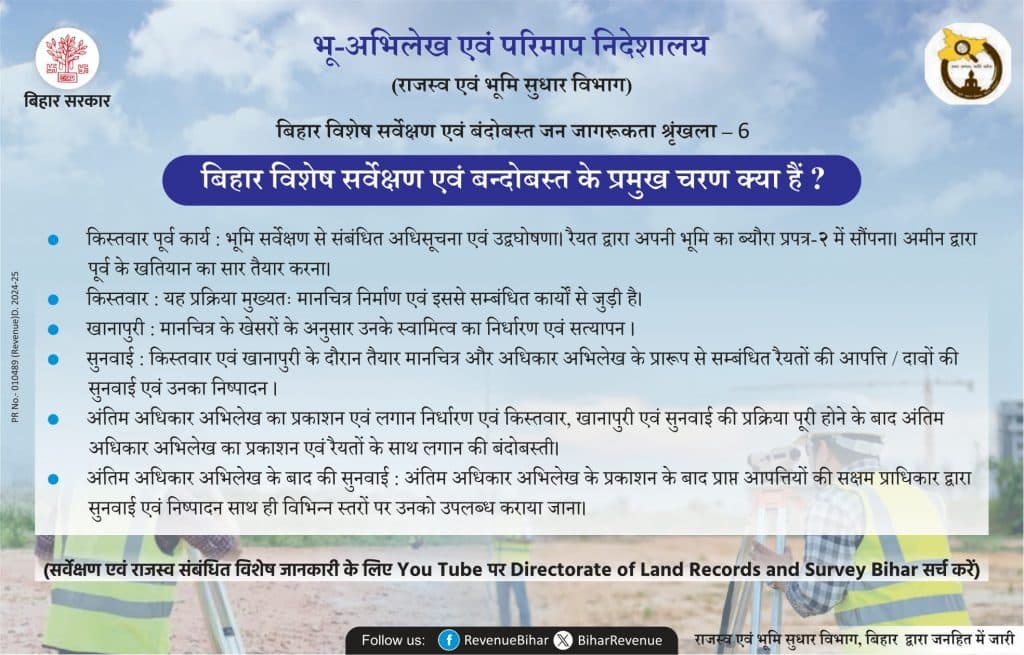 राज्य सरकार द्वारा जारी यह दिशा-निर्देश जन जागरूकता श्रृंखला का हिस्सा है, जिसके तहत लोगों को बिहार में चल रहे भूमि सर्वेक्षण और इसकी प्रक्रिया के बारे में जानकारी दी जा रही है. इसी श्रृंखला में अब बिहार विशेष सर्वेक्षण एवं बंदोबस्त के प्रमुख 6 चरणों के बारे में बताया गया है.
